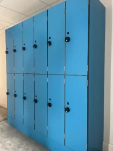The laminate lockers were manufactured with a mild steel carcass, which was powder-coated in ‘Ice’ from Helmsman metal colour chart. The lockers were completed with ‘California Blue’ laminate doors, along with the end panels to cover the exposed ends of the locker row, from the Helmsman standard laminate colour chart. This created a vibrant look, bringing a bold splash of blue to the hallway.